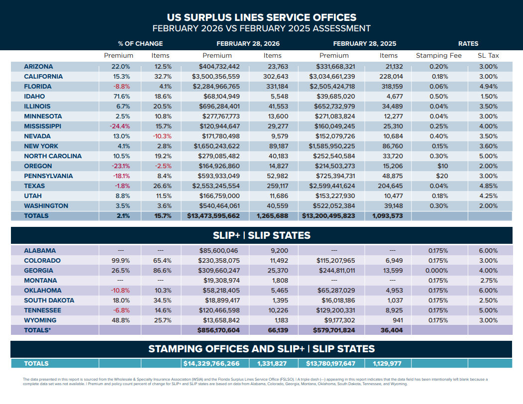 E&S Industry Insights brings together market data, industry reporting, and research to highlight trends, premium activity, and developments shaping the nation’s surplus lines marketplace. These resources draw on data, industry analysis and insights informed by activity across the states using the SLIP+ platform.
